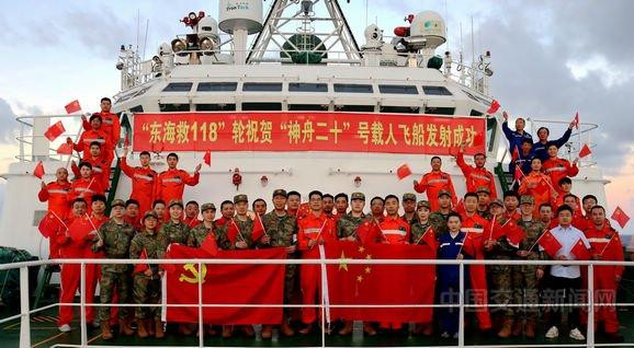 图为“东海救118”轮庆祝神舟二十号载人飞船发射成功。